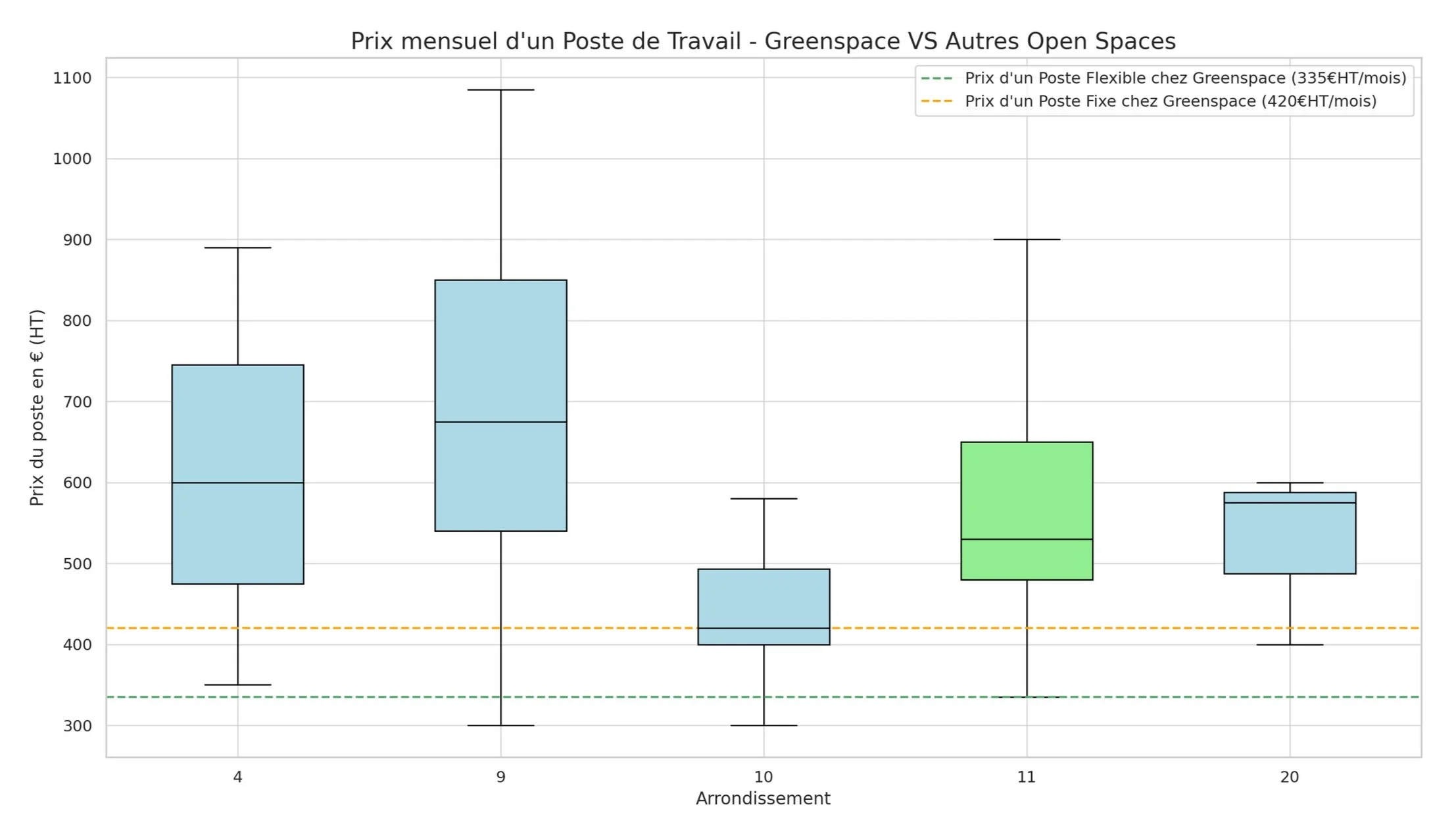Source Workthere - Données récoltées le 1er septembre 2023 - 105 Points de données utilisés dans cette analyse. Les valeurs extrêmes ont été retirées sur la base de la règle de l’interquartile afin de présenter des données les plus proches de la réalité du marché. En raison d’un manque de données, le 3eme arrondissement a été retiré. Est entendu par “Autres Open Spaces” l’accès à un poste de travail individuel (fixe ou libre) dans un Open Space.